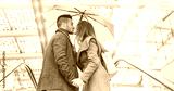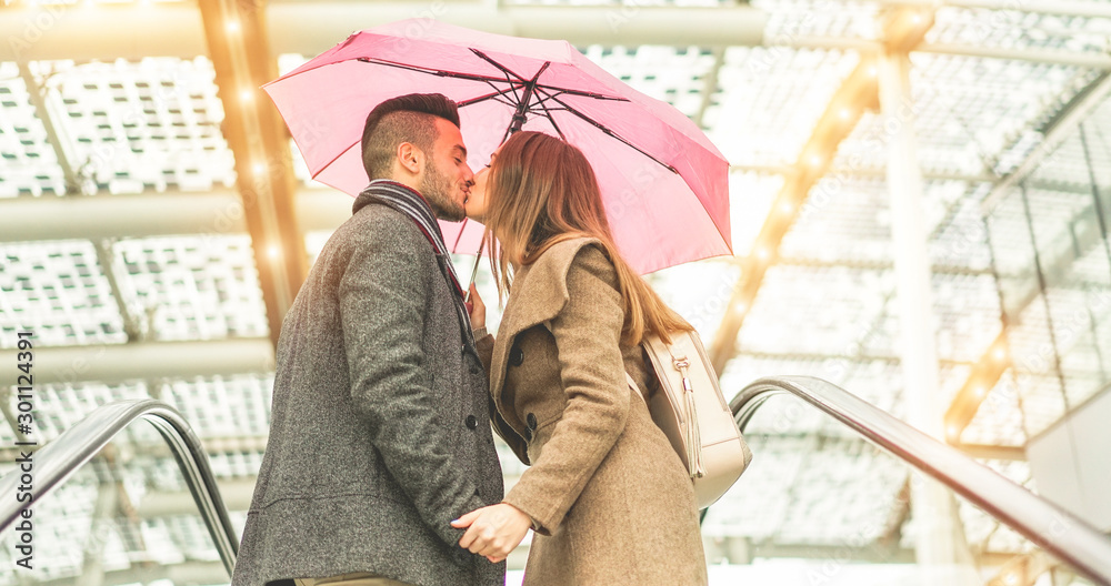 Young couple having tender moments under the rain before going inside mall city center - Lovers kissing outdoor - Love, sale, winter and relationship concept - Soft focus on faces
