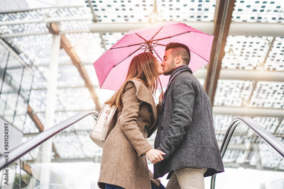 Young couple having tender moments under the rain before going inside mall city center - Lovers kissing outdoor - Love, sale, winter and relationship concept - Soft focus on faces