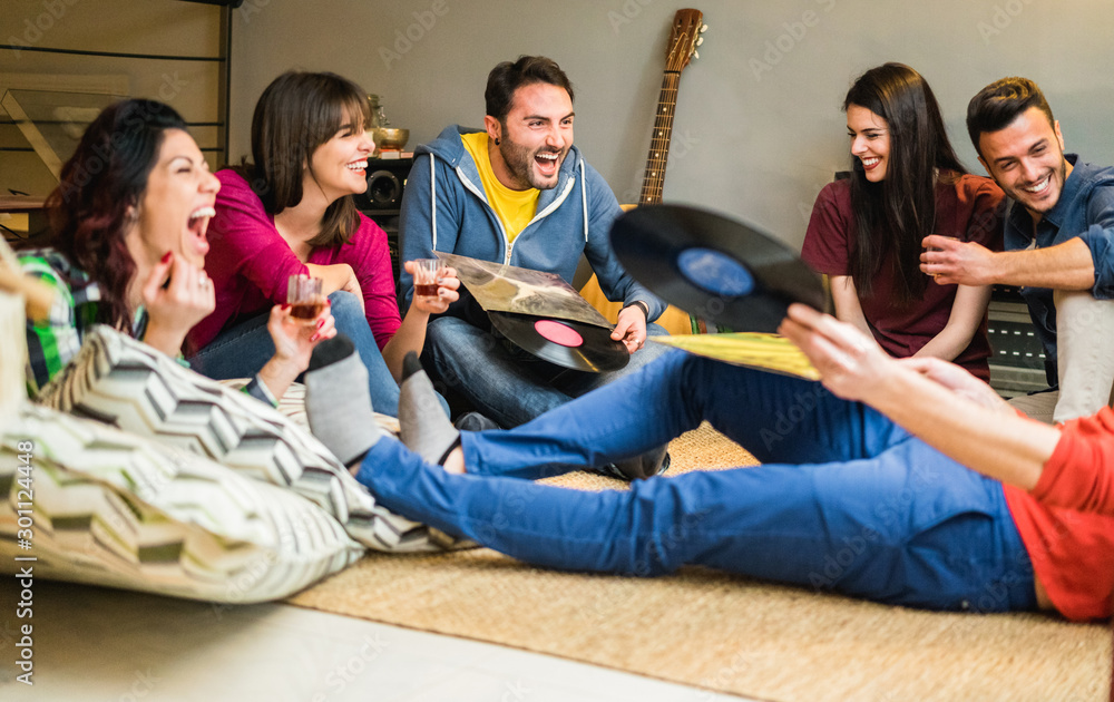 Happy friends having party at hostel listening vinyl vintage music - Young people drinking and having fun together - Youth, travel, friendship and trendy lifestyle concept - Focus on left man face