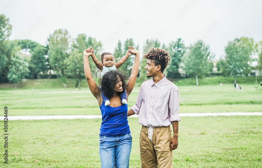 Happy african family having fun outdoor during sunny day in public park - Dad, mum and daughter enjoying tender moments together - Love and parenthood concept - Focus on faces