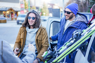 Young friends arrived at winter vacation village with skies and snowboards - Happy skiers having fun unloading the car - Extreme sport, holidays and friendship concept - Focus on left man face