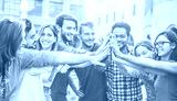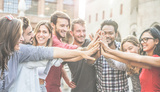 Diverse culture students stacking hands outdoor - Young happy people celebrating together - Youth, lifestyle, university, relationship, human resources, work and friendship concept - Focus on hands