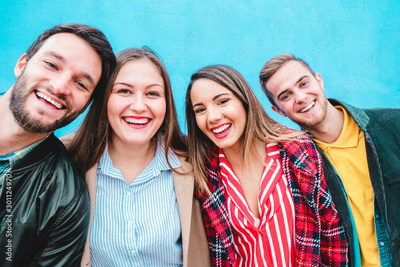 Happy friends taking selfie with turquoise background - Students having fun with technology trends at erasmus university - Youth, tech and friendship concept - Main focus on faces
