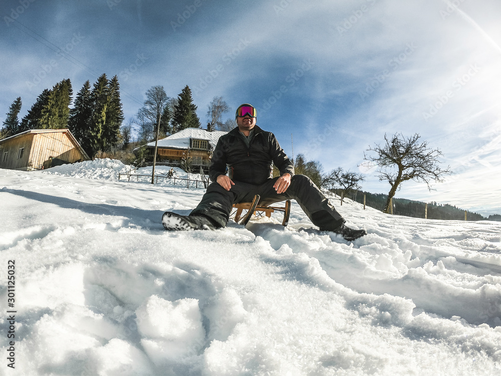 Young man having fun with wood vintage sledding on snow mountain landscape with chalet in background - Happy guy enjoy winter vacation - Holiday and nature concept - Focus on his face