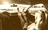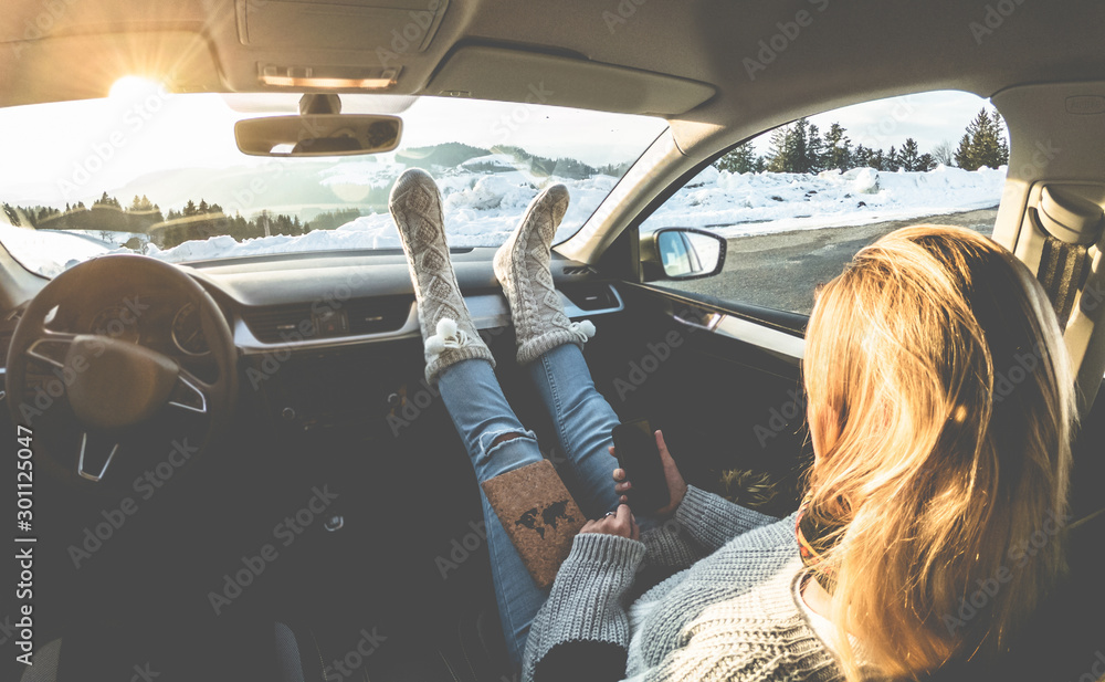 Woman using smartphone inside car with feet warm socks on dashboard - Girl relaxing in auto trip reading travel book with snow mountains in background - Traveler concept - Focus on feet