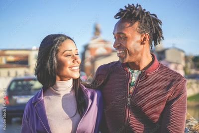 African couple having fun outdoor in city tour - Young people lovers enjoying time together during vacation journey - Love, fashion, travel and relationship concept - Focus on guys faces