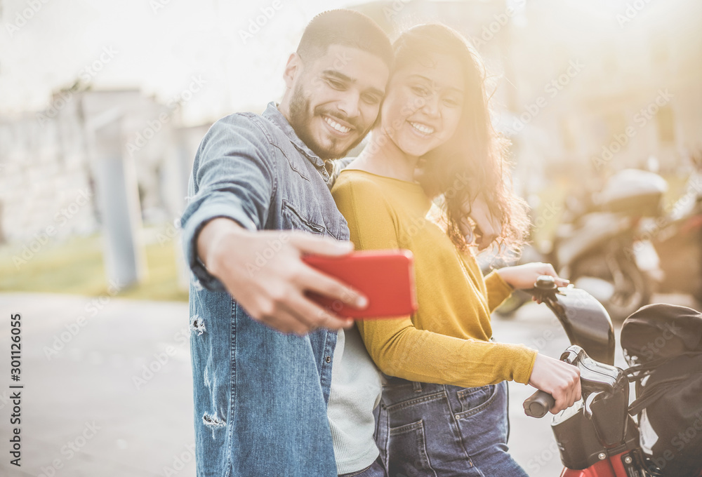Young people making short video while riding electric bicycle in Barcelona - Happy couple having fun with new trends technology - Travel, tech and eco concept - Focus on faces