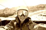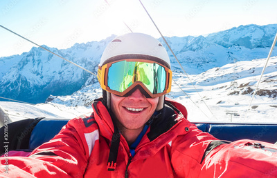 Happy snowboarder taking selfie photo with smartphone camera sitting on ski lift - Young man having fun in winter snow resort vacation - Extreme sport and technology trends concept - Focus on face