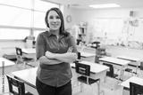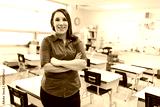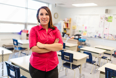 Pretty teacher smiling at camera at back of classroom at the elementary school