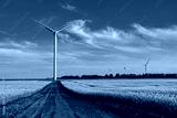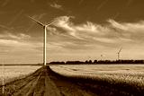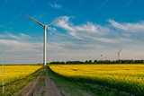 Wind turbine at the end of a road in the middle of a canola field in bloom