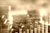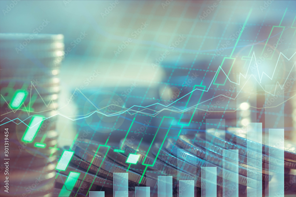 Financial investment concept, Double exposure of city night and stack of coins for finance investor, Forex trading candlestick chart, Cryptocurrency Digital economy.
