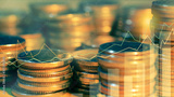 Financial investment concept, Double exposure of city night and stack of coins for finance investor, Forex trading candlestick chart, Cryptocurrency Digital economy.