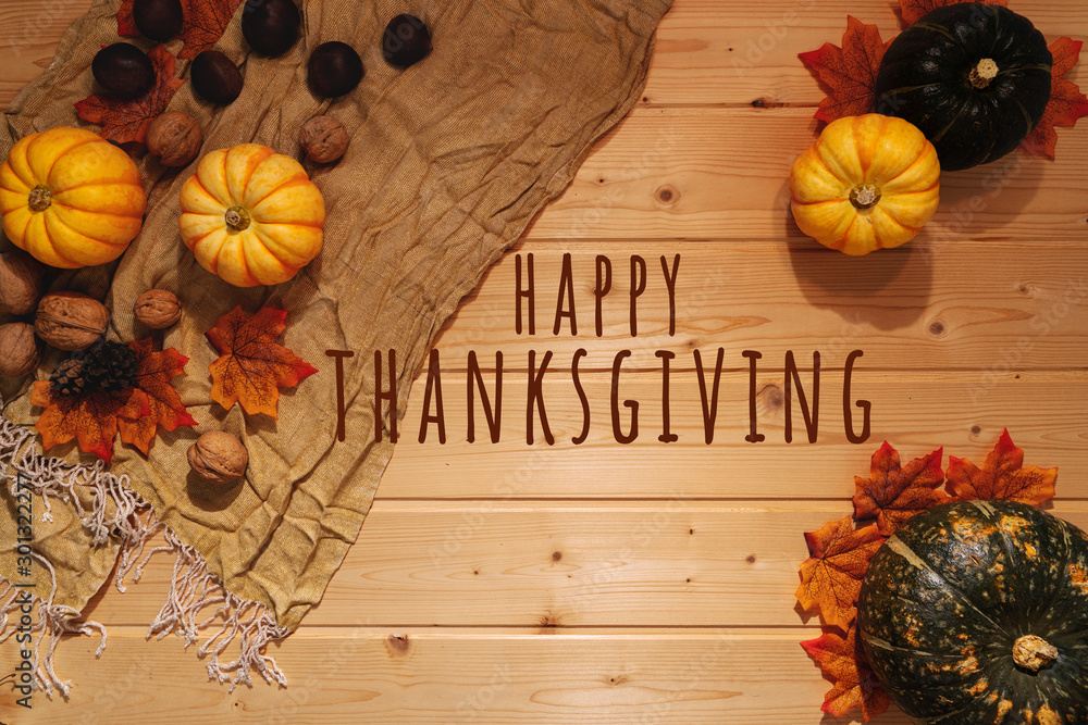 Happy Thanksgiving Day with pumpkin and nut on wooden background