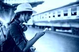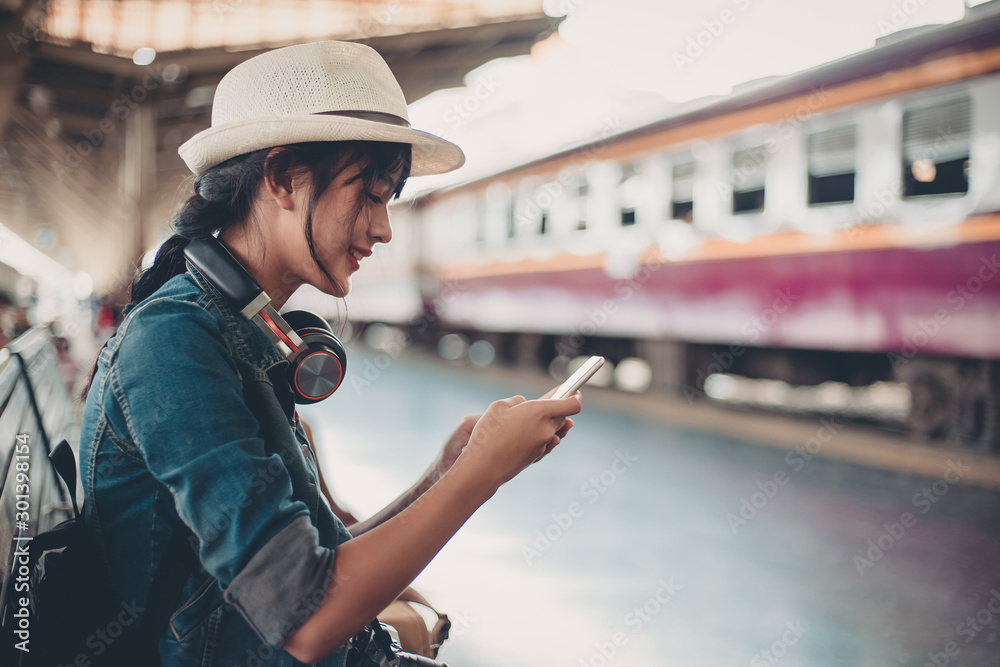 Asian tourist teenage girl at train station using smartphone map, social media check-in, or buy ticket booking. Modern travel app technology, lone traveler, Summer vacation railroad adventure concept