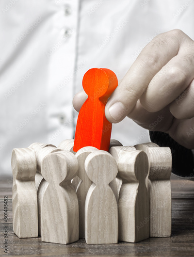 Team leadership concept and choosing a new leader. Choice of person. Hiring and recruiting. Human resource management. Talented worker. Wooden figures of people. Selective focus