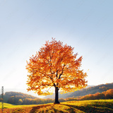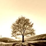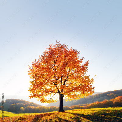 Majestic beech tree with sunny beams at autumn mountain valley. Dramatic colorful evening scene. Carpathian mountains, Ukraine. Landscape photography
