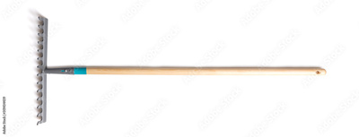 Rake with a wood handle isolated over a white background. Metal work tool with wooden handle