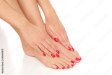 Beautiful red manicure and pedicure isolated on white background.