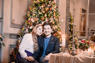 couple of beautiful young blonde girl her boyfriend on background merry Christmas happy new year tree lights with star gift decor. Family shooting