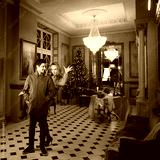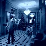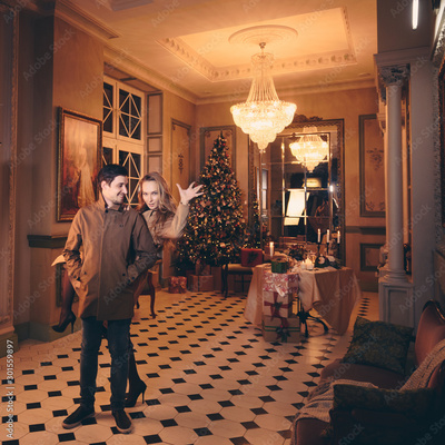 couple of beautiful young blonde girl her boyfriend on background merry Christmas happy new year tree lights with star gift decor. Family shooting