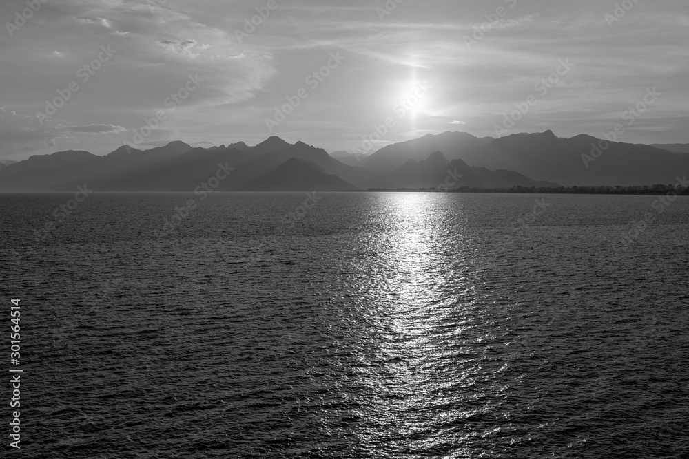 Aerial top view of peaceful calm dark blue sunny sea water surface, cloudy sunset or sunrise sky and silhouettes of mountains with soft sun over peaks. Black and white horizontal color photography.