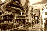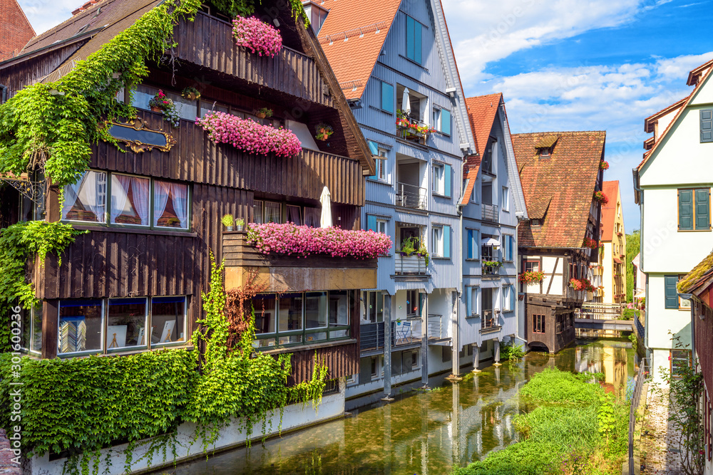 Vintage street with houses decorated by flowers in old town of Ulm, Germany. Nice view of historical Fisherman`s Quarter in summer. It is a landmark of Ulm. Ancient district of Ulm city with canals.