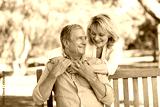 Senior woman hugging her husband who is on the bench