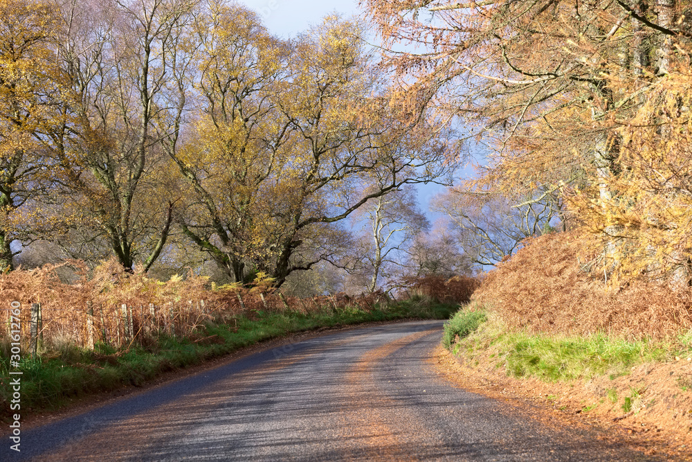 Autumn fall road with orange leaves on trees and tarmac at Glenesk in Scotland