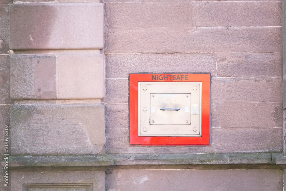 Nightsafe metal box in wall with red trim to keep one safe at night