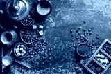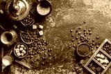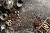 Coffee cup with coffee grinder and coffee beans on dark textured background.