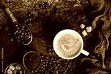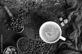 Coffee board with coffee beans on dark textured background.
