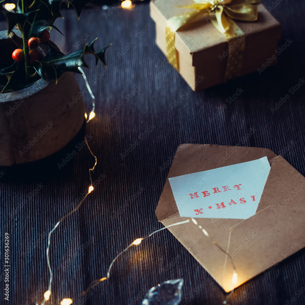 Festive composition of Merry Christmas card in craft envelope, gift box, berry holly ilex aquifolium in vase and lights on dark gray napkin. Dark scandinavian style. Square card. Top view. Copy space