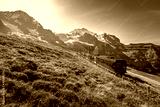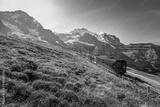 Electric tourist train and snowy Jungfrau mountains in background, Switzerland