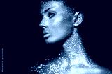 Fashion model woman in bright sparkles and lights posing in studio. Portrait of beautiful sexy woman. Art design glitter glowing make up. Black and white photography