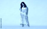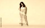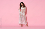 Beautiful brunette in long, lace, half transapernt white dress isolated on pink background.