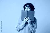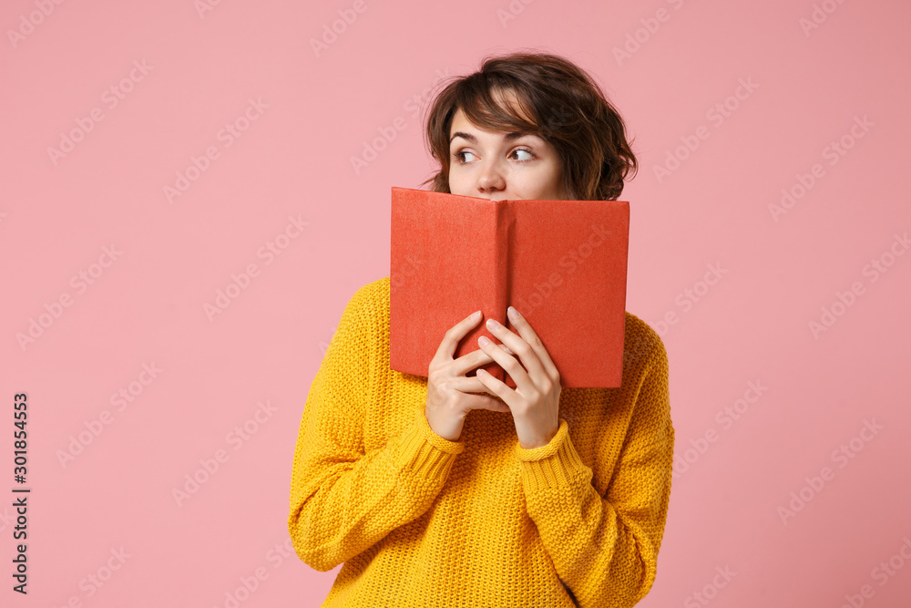 Young brunette woman girl in yellow sweater posing isolated on pink wall background studio portrait. People sincere emotions lifestyle concept. Mock up copy space. Holding covering mouth with book.