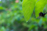Close up of green plant leaf with water droplet