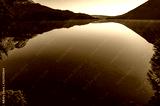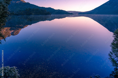 Mountain sunrise landscape with mirror like water surface, mountain reflection