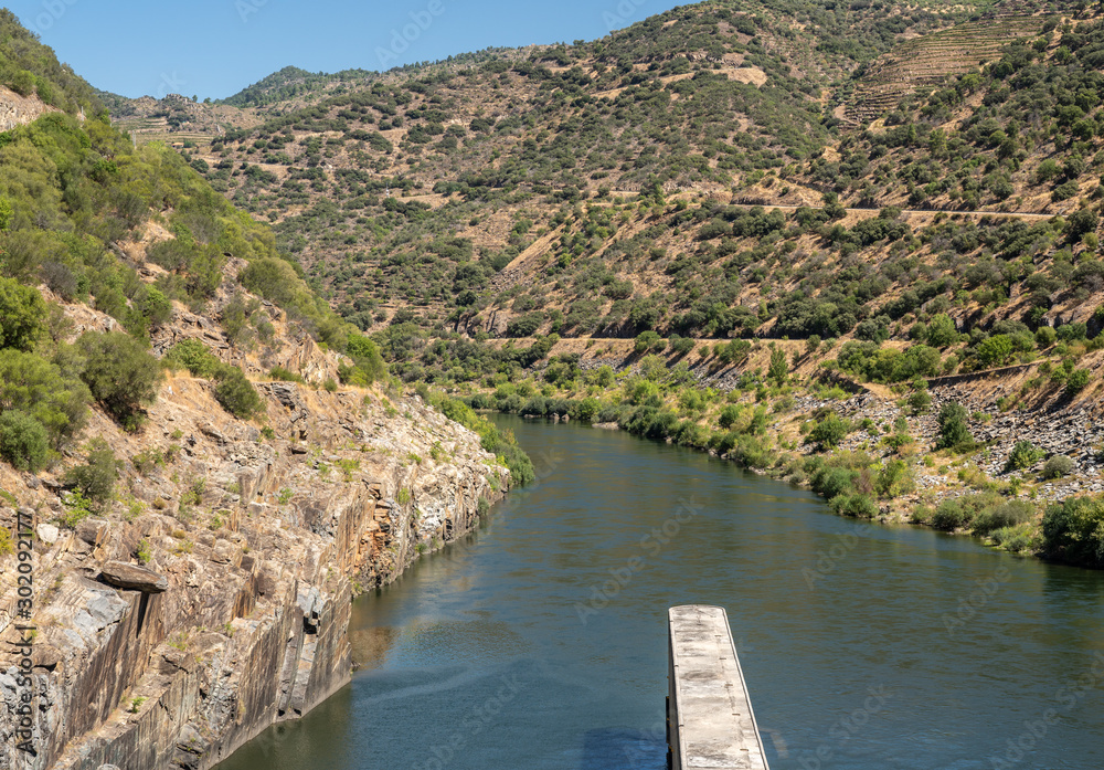 Solid structure of the Valeira dam on River Douro looking down into the gorge and narrow canyon