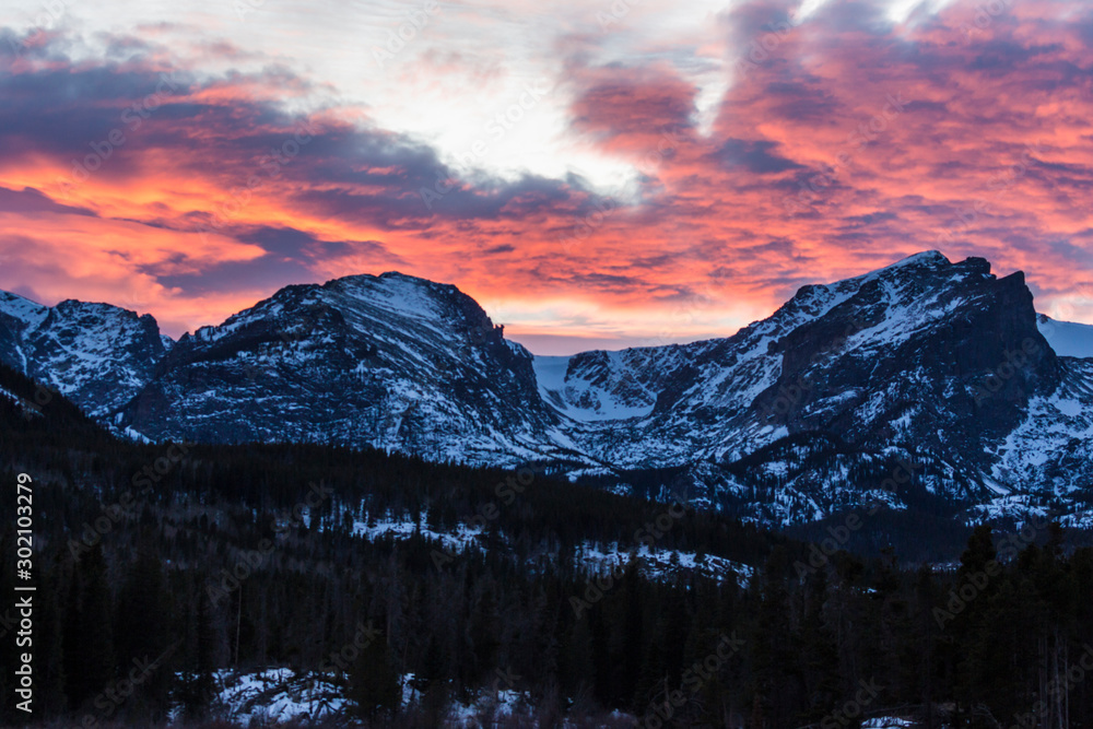 A beautiful sunset over the Rocky Mountains near Sprague Lake in Rocky Mountain National Park.