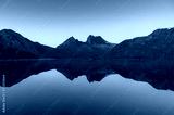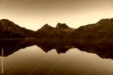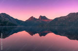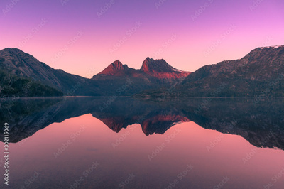 Picturesque nature background with Cradle Mountain and lake at sunrise