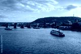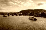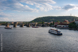 Vltava river with cruise ships and boats and Charles Bridge landmark