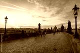 Tourists at sunrise on Charles Bridge landmark in Prague