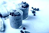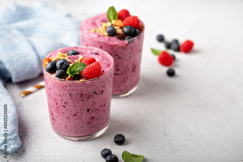 Berry smoothies with raspberries and blueberries with copy space