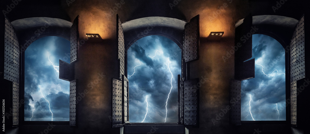 Window view of sparkling lightning in the old town. Concept on the theme of weather, natural disasters, apocalypse, etc.
