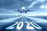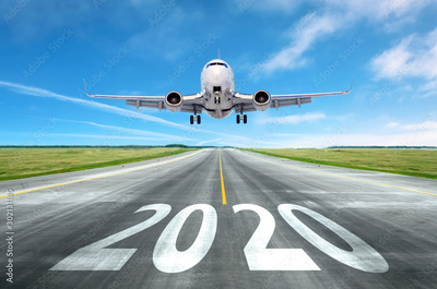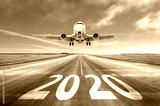 The inscription on the runway 2020 surface of the airport runway with take off aircraft. Concept of travel in the new year, holidays.