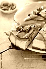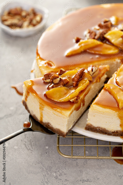 Apple caramel pecan cheesecake with dripping sauce with a slice cut out