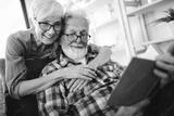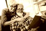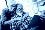 Beautiful old couple is reading a book and smiling at home