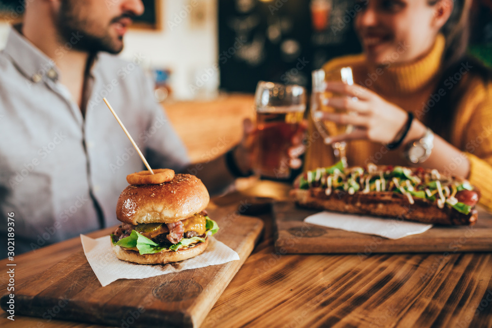 friends making a toast in bar, while eating fast food