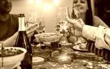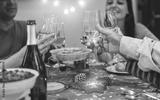 Happy family cheering with champagne for Christmas eve - Hands view of people toasting wine and celebrating together - Holidays, dinner, and winter concept - Focus on right close-up hand